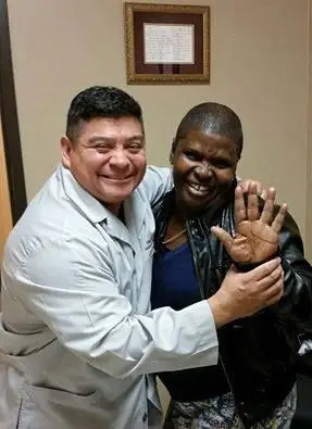 Janet, pictured with Dr. Loredo, is showing off her pain-free hand. A victim of Hurricane Katrina, she lost her health coverage and was not able to have the treatment for her hands which she desperately needed. She came to see Dr. Loredo and underwent minimally-invasive hand surgery. Janet says she is doing great and is able to hold her grandbabies!